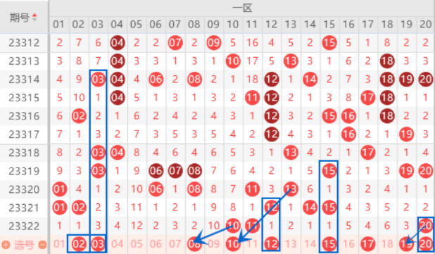 上期的连号01 02号数字没能出重号,本期我们要注意一下落下一个号码的情况,本期的03号数字是属于空三对称,本期注意一下02 03或者03 04号数字同出的情况。本期的06 07 08号数字我们要防守一下落下一个号码的情况了,重点关注一下08号数字,上期开出了10号数字,本期有可能会把08号数字带出来的。连号空一带号12 14 15号数字上期没能开出重号,本期我们要注意一下回补的情况,重点关注一下12 15号数字的回补情况。本期的19号数字是属于五斜连号码,可以防守一下,好久没有出了。