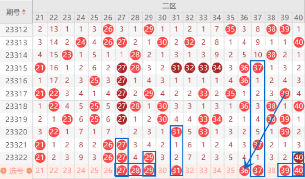 上期开出了26 27号数字的重号,本期我们要注意一下出一个三重的情况,本期的29号数字我们也是要注意出重的情况的,本期这里我们注意一下出现连号27 28 29号数字的情况。本期的31号数字我们可以关注一下,在尾数走势图上是非常好看的,本期出号机会也是有的。本期的35 36号数字我们要注意落下一个号码的情况,重点考虑一下36 37号数字同出的情况。本期的39号数字我们要关注一下,防守一下39 40号数字同出的情况。