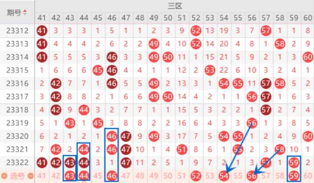 上期开出了5连号码40 41 42 43 44号数字,本期我们要注意一下出现重号的情况,重点关注一下40 43 44号数字出重的情况。本期的46号数字我们防守一下,最近这种类型的号码都不怎么出了,做一下防守吧。本期的52号数字是属于遗漏9期的号码,本期遗漏9期的号码有三个,本期是有机会出一个的,我们重点关注一下52 61号数字的出号情况。本期的56号数字我们关注一下,属于三斜连号码,和上面的55 56 57刚好对应,出号机会还是有的。