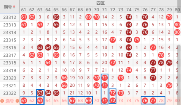 该区间的三连号63 64 65号数字我们也是要注意一下出重号的情况,重点关注关注一下63 65号数字出一个重号的情况。上期在65-72之间断号了,本期这里有三个冷号,我们要注意一下出一个号码的情况,重点关注一下67 69号数字出一个号码的情况。重号70 71号数字本期我们也会要注意落下一个号码的情况的。上期开出了连号71 72,本期我们注意一下出一个重号的情况。