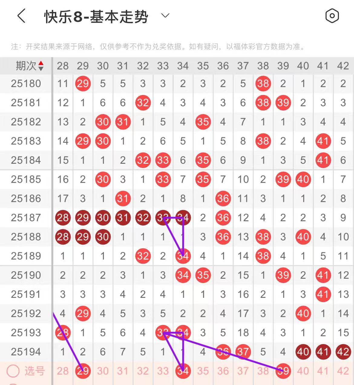 31-40区:本区间上期开出了三个号码,从号码走势图上看,该区现属于温冷区,本期可参考的号码走势甚少,出号个数应该在两个号码左右。本期有出号走势的号码有34号,形成一个三角走势形态,39号,斜连出号走势。