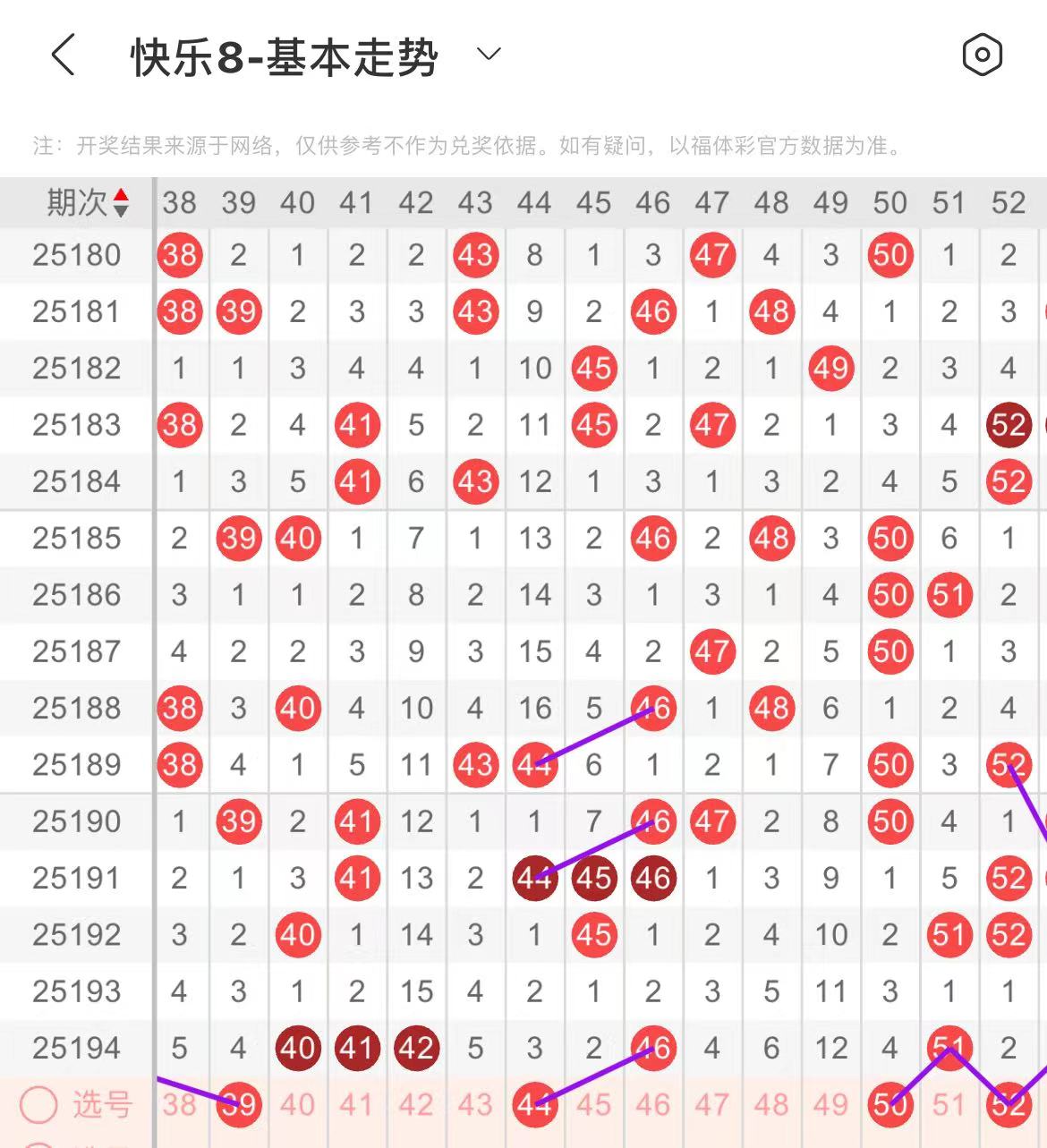 41-50区:本区间上期开出了三个号码,从号码走势图上看,该区断区后直接回补了三个号码,本期继续关注该区号码回补,出号个数应该在两个号码左右,本期有出号走势的号码有44号,46对应44出号走势,50号,做为边号开出。