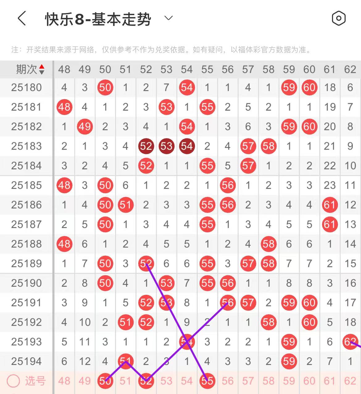 51-60区:本区间上期开出了两个号码,从号码走势图上看,该区号码走势走冷趋势明显,在选号上谨慎,本期出号个数应该在一两个号码之间。本期有出号走势的号码有52.55号,均有斜连出号走势。