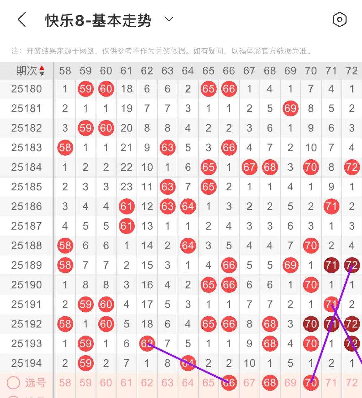 61-70区:本区间上期开出了一个号码,从号码走势图上看,该区现属于温号区,重点关注后半区号码回补,出号个数应该在两个号码左右。本期有出号走势的号码有66号,斜连出号走势,防66.68同出的可能,70号,斜连出号走势。