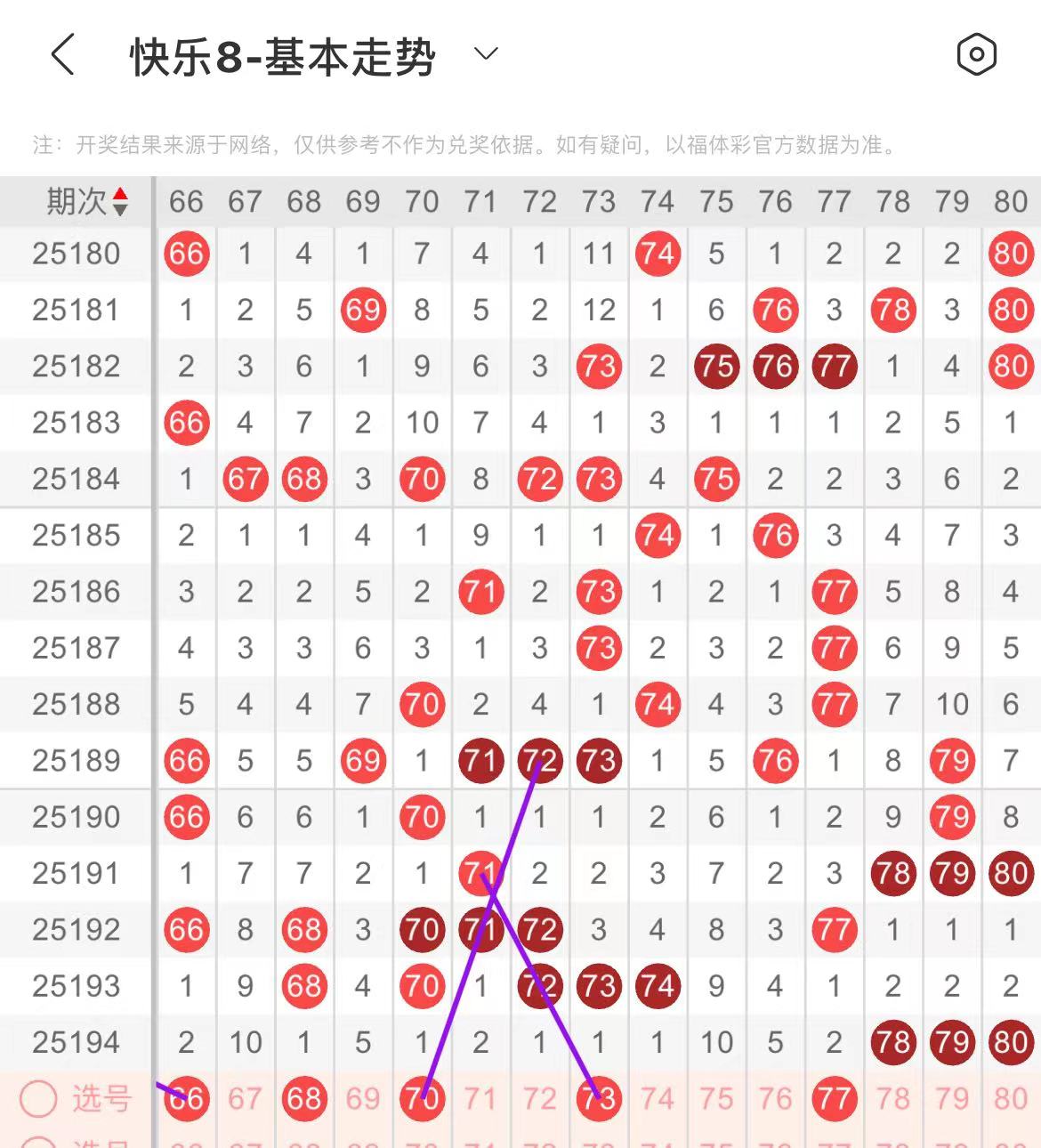 71-80区:本区间上期开出了三个号码,从号码走势图上看,该区现属于温热区,出号个数保持在三个号码左右,本期出号个数变化应该不是很大。本期有出号走势的号码有73号,斜连出号走势,77号,做为边号开出。