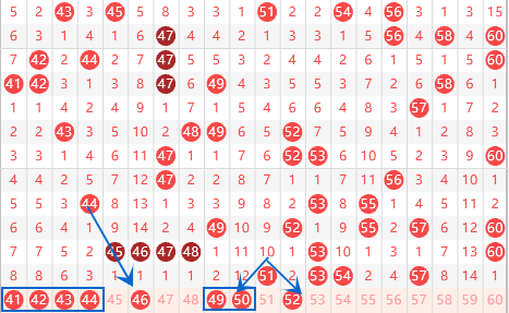 连号41 42本期我们要做号了,直播时就一直说41 42到遗漏8期的时候在做号,那么本期就到时机了,本期这里也是可以定一胆码出来的。四连号45 46 47 48上期没能出重号,那么本期落下一个号码的情况就比较大了,我们要重点考虑一下。上期的冷连号50 51开出了51号数字,那么本期我们就要注意50号数字的出号情况。连号空一带号51 53 54我们也是要注意出重号的情况的,夹号52号数字我们也是可以关注一下,属于大长斜连号码。