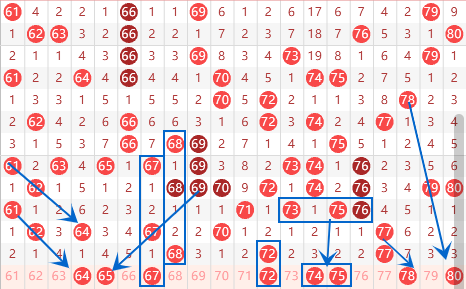 本期的64号数字我们可以注意一下,斜连61 62大多数情况下都是带64的,这个我们可以重点关注一下。本期的67号数字和68号数字的走势有点类似,我们可以防守一下。连号空一带号73 75 76本期应该是要落号了,这里我们要重点关注一下,还是有机会出两个号码的。
