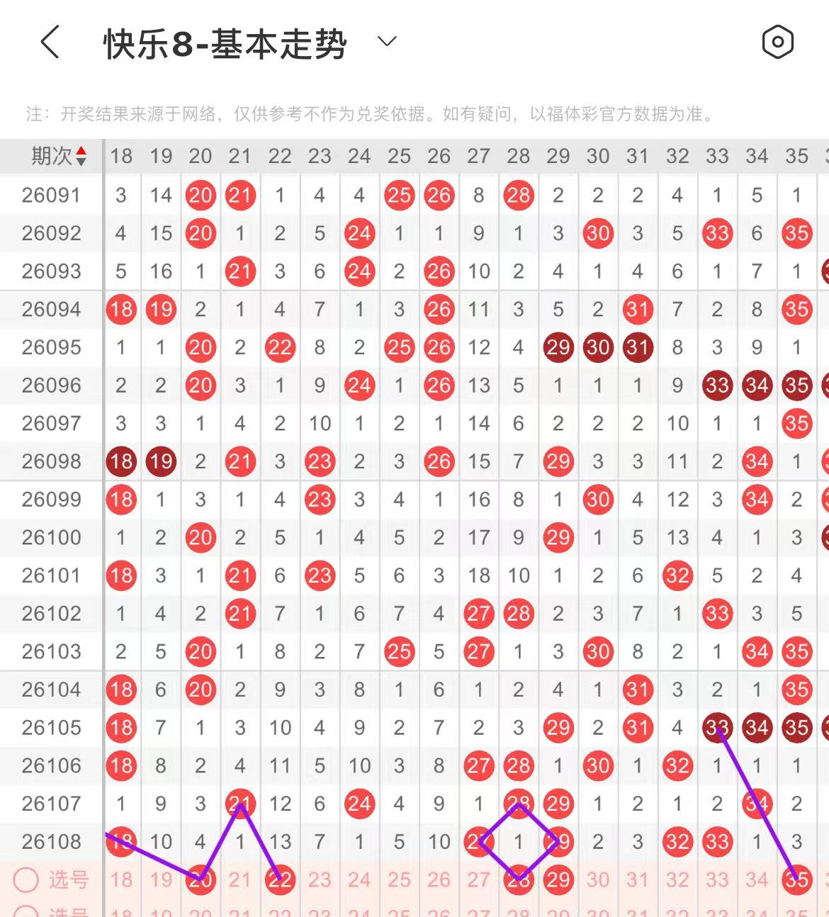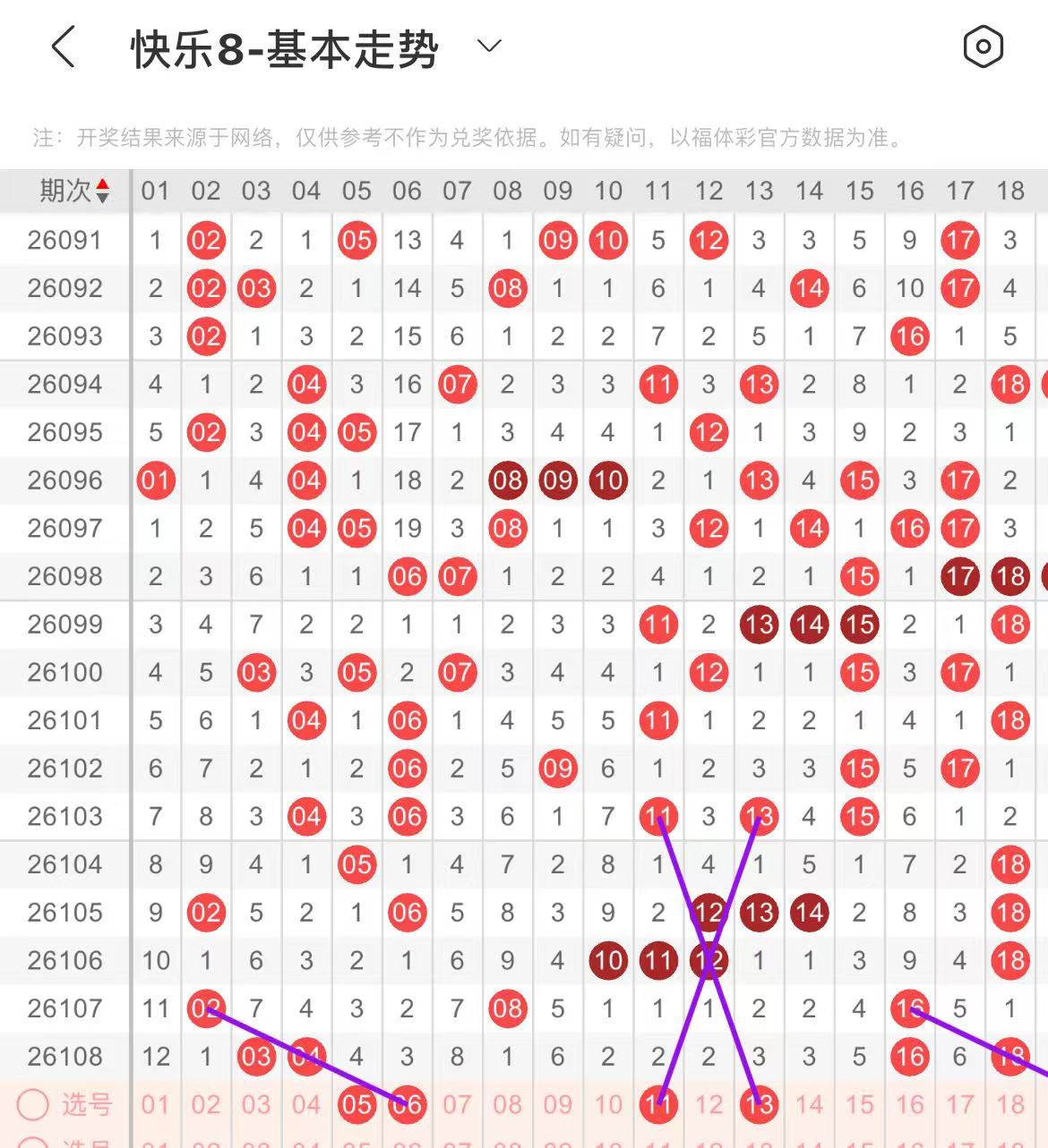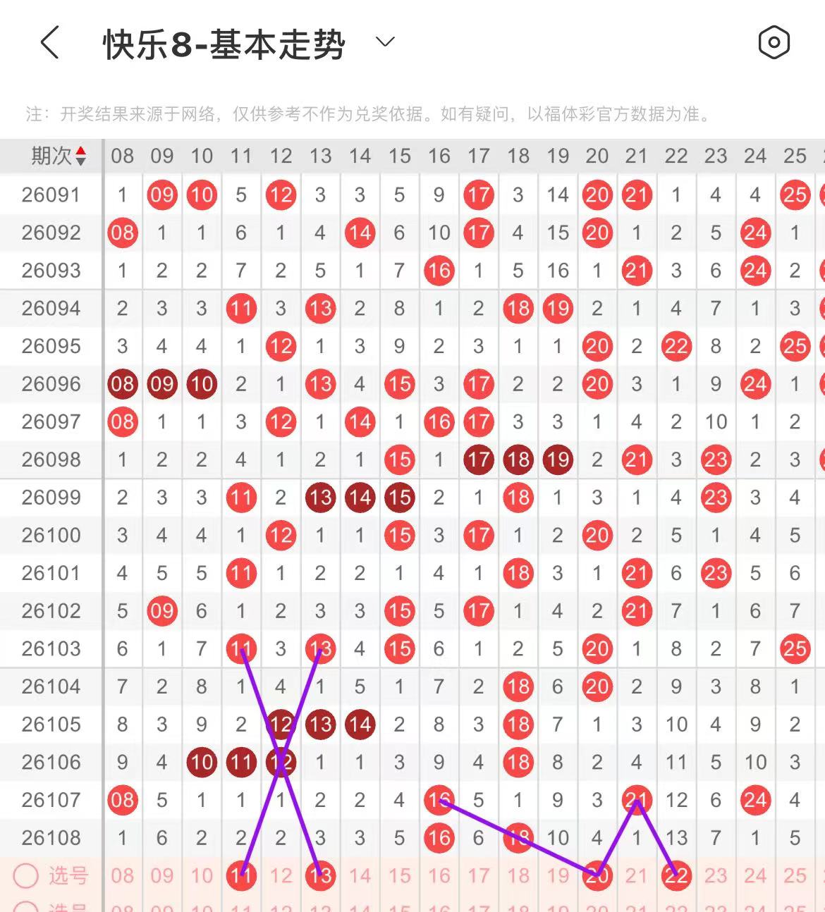 11-20区:本区间上期开出了两个号码,从号码走势图上看,前半区连续走空两期,本期注意号码回补,出号个数在三个号码左右,有出号走势的号码有11.13号,交叉斜连出号走势,20号,斜连出号走势。