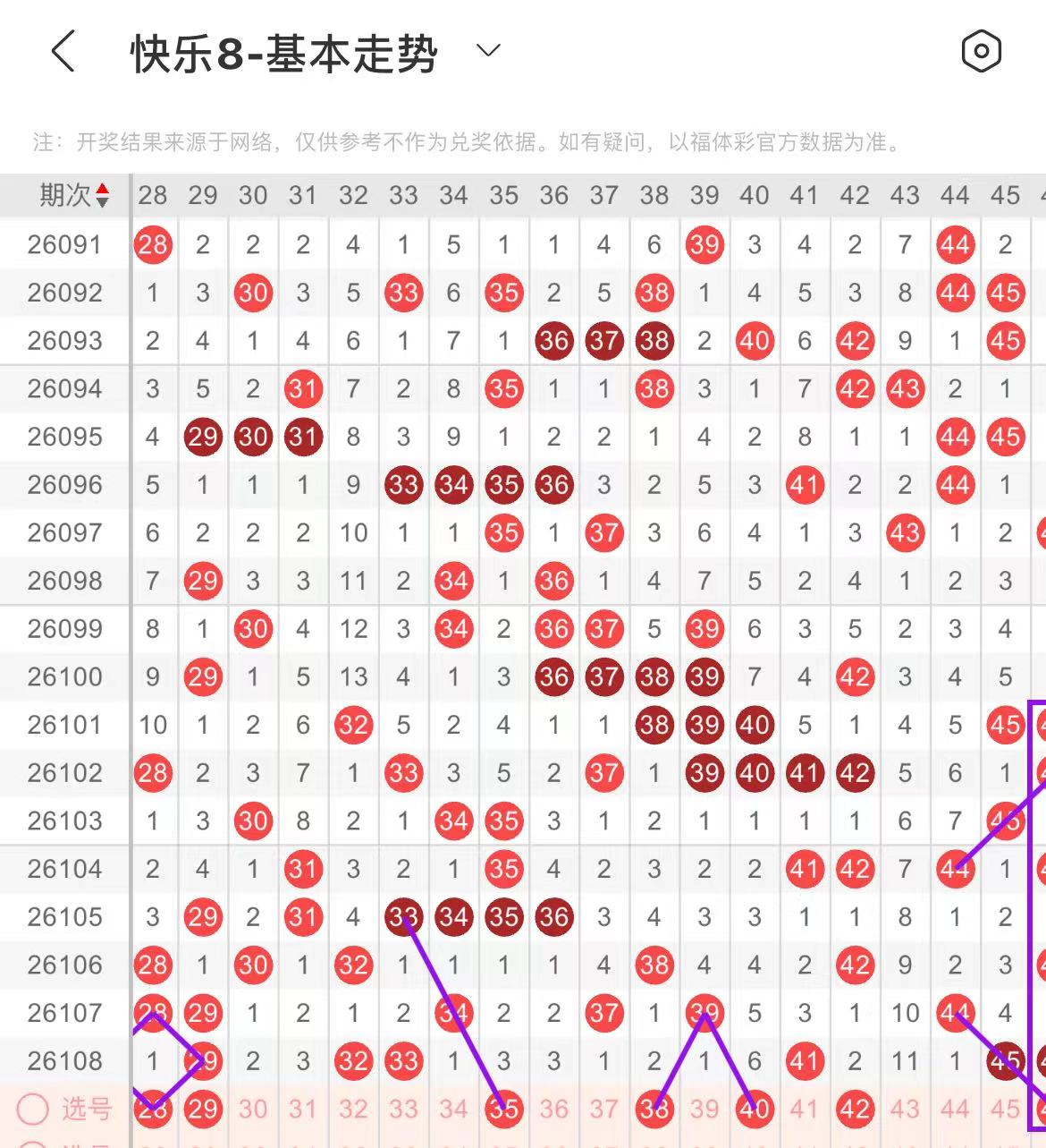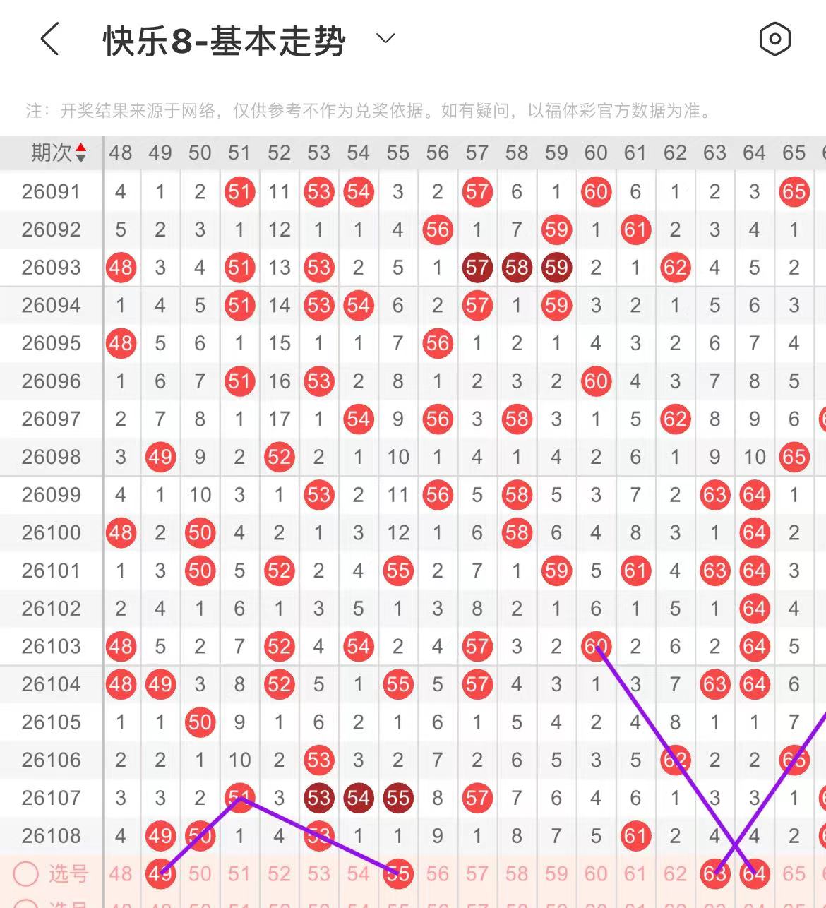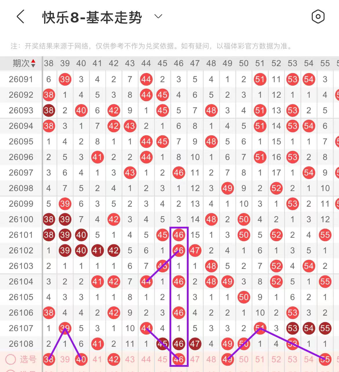 41-50区:本区间上期开出了六个号码,从号码走势图上看,该区号码走势走热趋势明显,本期出号个数应该还能保持在两三个号码之间,有出号走势的号码有46号,镜像斜连出号走势,防42.46同出,49号,斜连出号走势。
