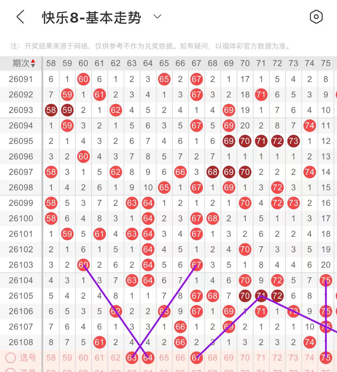 61-70区:本区间上期开出了两个号码,从号码走势图上看,该区现属于温号区,出号个数在三个号码左右,本期有出号走势的号码有63.64号,均有斜连出号走势,有同出的可能,67号,斜连出号走势。