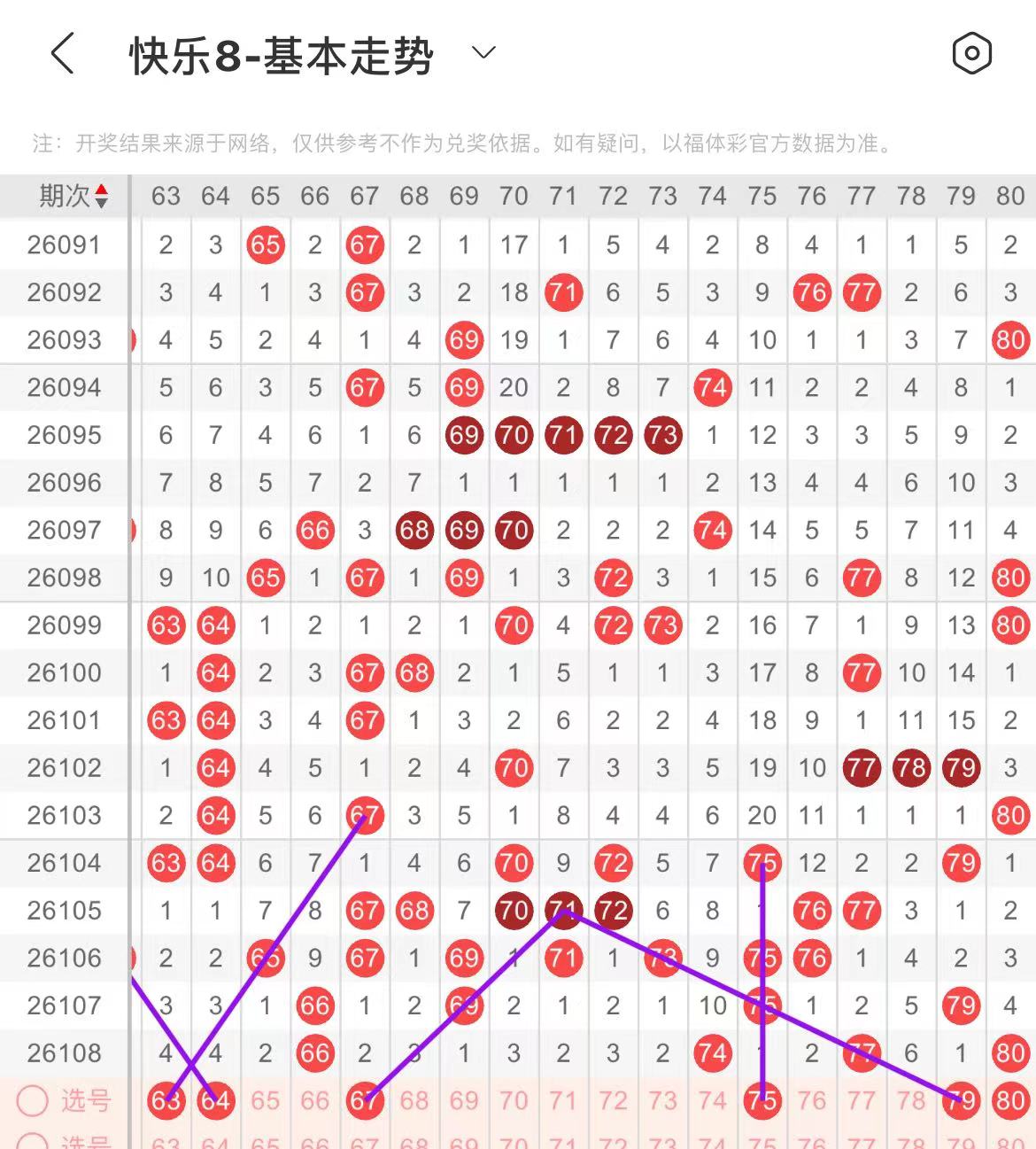 71-80区:本区间上期开出了三个号码,从号码走势图上看,本期重点关注后半区号码回补,出号个数在三个号码左右,有出号走势的号码有75号,上下对称出号走势,79号,斜连出号走势,防79.80同出。