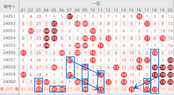 上期开出了03 04 08 09号数字,本期我们注意出重号的情况,重点关注一下03 09号数字的重号就行了。本期的05 06号数字我们注意一下出号情况,这里是有机会出一个号码的。本期的11号数字我们走势有点好,我们只能做防守,不做主胆来用,那么本期的10号数字我们就要注意了。本期的冷号15号数字我们注意一下出号情况。上期开出了17 19 20号数字的连号空一带号,本期我们防守一下出重号的情况,本期的夹号18号数字我们也是要注意一下的。