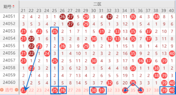 本期的21 24 27号数字是属于1路号码,已经遗漏3期了,本期我们要注意出一个号码的情况,重点关注一下21号数字的出号情况。本期的23 26 29 30号数字是属于0路号码,也是遗漏3期了,本期我们也是要注意出号情况的,重点关注一下26 30号数字的出号情况。上期开出了32号数字,本期我们注意一下走分边的情况。本期的35号数字也是这样的,注意走分边的情况。本期的39 40号数字我们要注意出重的情况。