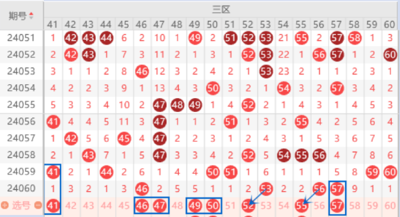 上期的01 11 41 51号数字都没有出重,那么本期我们就要注意回补情况了,重点关注一下41号数字的回补情况。本期的47号数字我们注意一下落号情况,属于重号回补类型。连号48 49和连号64 65号数字都是属于遗漏5期的号码,本期我们注意落下一个号码的情况,重点关注一下48 49号数字出一个号码的情况。本期的52号数字我们注意一下出号情况,属于空二对称号码,出号机会还是有的。上期开出了56 57号数字,本期我们注意出一个重号的情况。