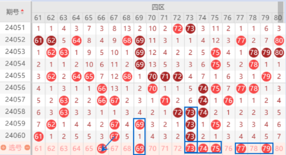 上期开出了67号数字的重号,本期我们注意一下走分边的情况。本期的69号数字我们注意一下出号情况。本期的73号数字我们注意一下走4重的情况,毕竟上期的20号数字也是开出了4重号,那么它会影响本期的73出4重的。本期的75号数字我们注意一下,本期的走势很好,所以本期我们做一下防守就行了。本期的77 78号数字我们注意一下出一个号码的情况。