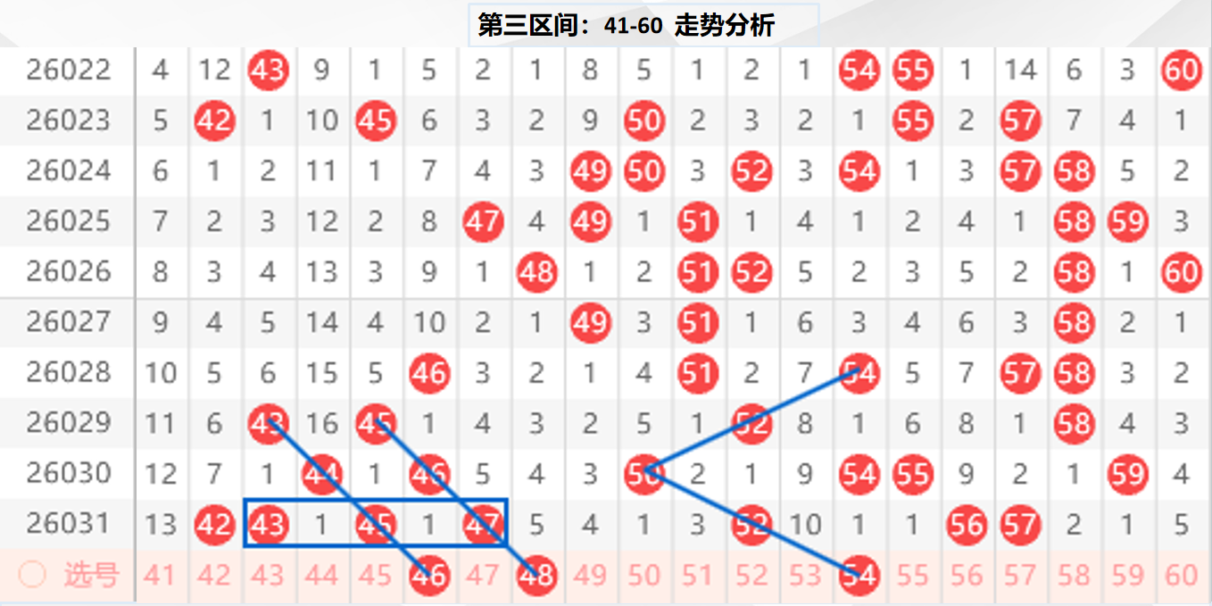 三区分析:【41-60】(走势图标注号码非小黄车大底,请谨慎参考,具体思路将在直播间分享讨论)