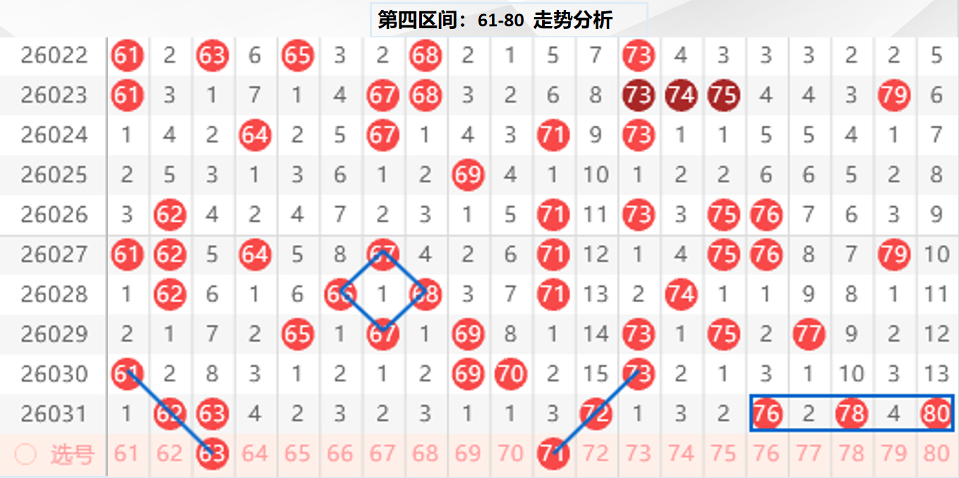 四区分析:【61-80】(走势图标注号码非小黄车大底,请谨慎参考,具体思路将在直播间分享讨论)