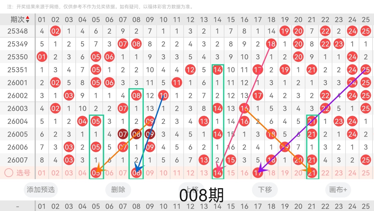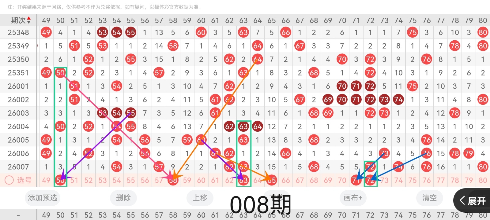 通过以上对上期的简单回顾,下面进入2026008期(下面简称本期)的选号分析: