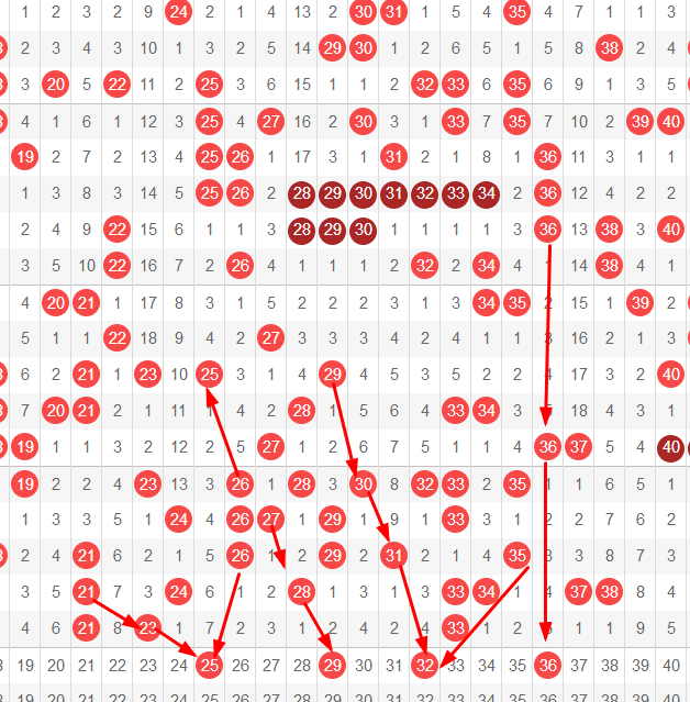20~40区域推荐的号码第一个25号,我们看到25号从21号间隔一期出23,再间隔一期出25的一个间隔一协联走势,同时看25和26的关系,26往上两期出。25,那么往下两期也出25。然后是29号,我们看到了二期间隔一期28,再间隔一期29的一个走势。还有一个就是32号,32号从上面开始,29间隔两期出30,间隔一期出31,再间隔两期出32,形成一个对称,同时从旁边的35~32的一个斜连,36是上下对称的一个走势,所以这个区域如何去选择。大家自己根据经验去选。