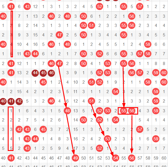 4零到六零区域推荐的号码如下,首先我们看41号是一个上下对称间隔5的走势,然后它具备一个43间隔4~42冲下来的一个走势。然后就是49号这个冷码17期了,你只没出,今天看到了走势,从47间隔四期出48,再间隔四期出49的一个走势。自己想着要不要去带这个码,然后就是54号,5月4号,我们看到了从51一直走下来,间隔一的斜连56号和55号形成了一个对比,55间隔四期出55.56,然后再间隔四期出56这样的一个 n 型对比。所以这个区域的号码推荐如下,大家自己去选择。