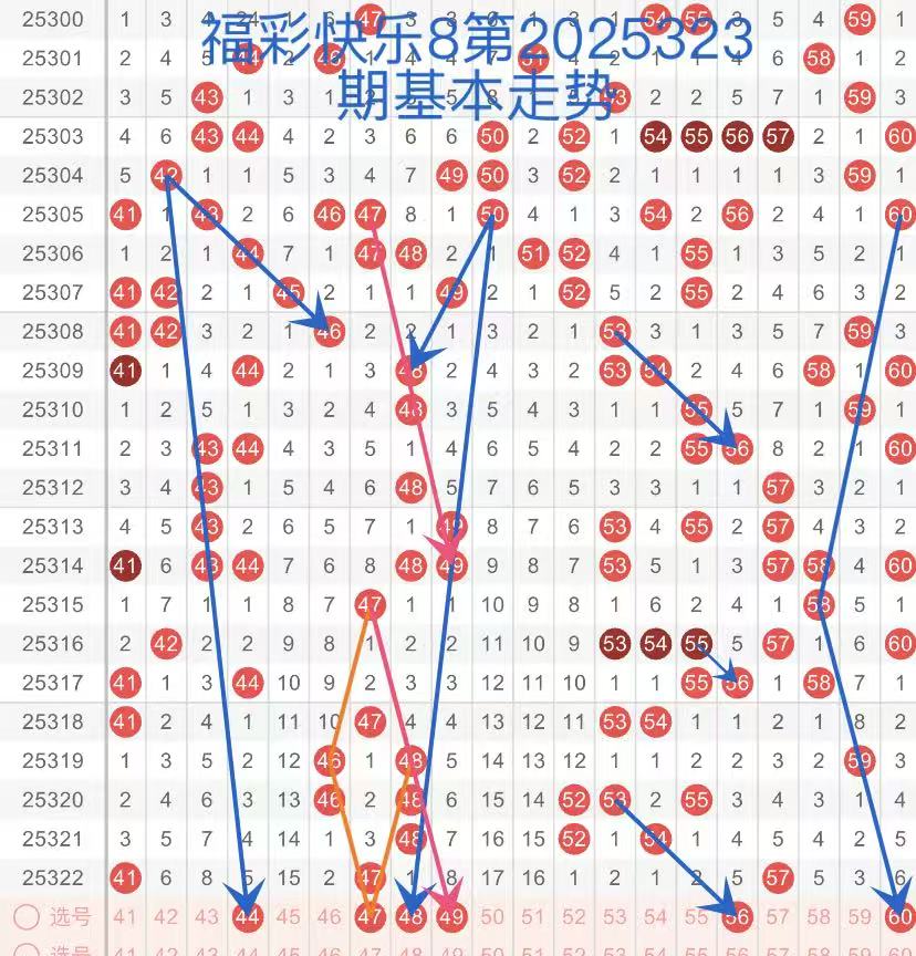 第三区间(41-60):结合近3期第三区开出号码比例5:3:3,预判本期开出号码在4到5个。44.48号球呈斜跨回折走势,47号球呈33回折走态,49号球连续遗漏多期本期呈斜跨走势,在近期走势类似的趋势下注意关注。56号球呈断斜连走势,60号球呈三角回折走态,注意关注。