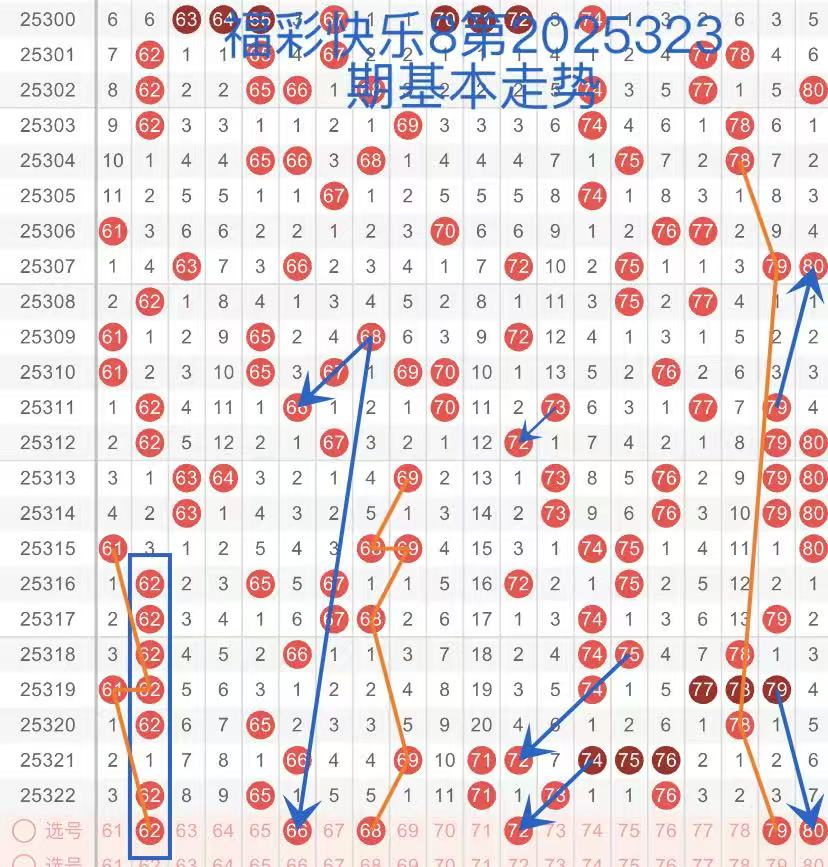 下面是我对2025323期福彩快乐8的分析和预判,希望通过我的分析能让大家今晚大满贯!福彩快乐8上期开奖号码如下图