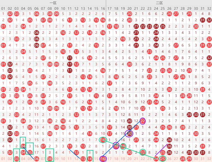 二区边号19 21 23 24 27 28 32出1-2码,重号20 25 26 29出一码,形态上24 25 29是斜连号上图已勾画,本期1开头17 18 19最少出1码,重号优先29 25,3开头防32,隔4期号出多期,本期只有28,关注六码 17 19 23 25 29 32