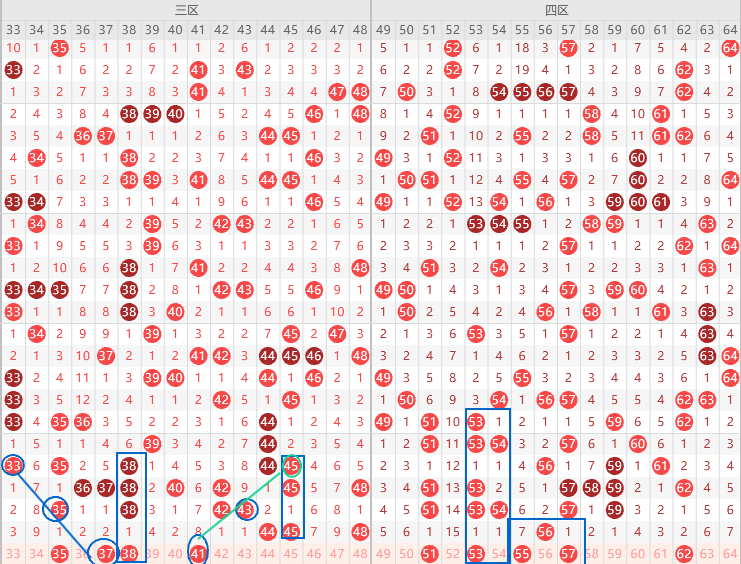 三区边号43 46 47三出一,重号防44 45 48,其次8尾最热38 48二出一,5尾35 45选一,遗漏值35 38 42 43四出一,形态上37 41是斜连号,上图已勾画,关注五码35 37 41 43 48