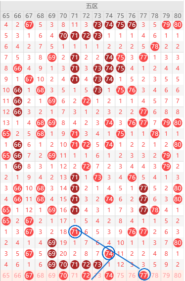 五区边号68 74,重号69 70 71 72 73出一码,71 72 77形态上是斜连号,上图已勾画,重号73 72优先,本期74跟上面形态一样,隔一回补,可以用, 9尾最热防79,遗漏值67 74二出一,关注五码67 68 69 72 74防79