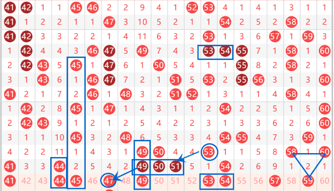 下图为41-60号数字区间走势分析图: