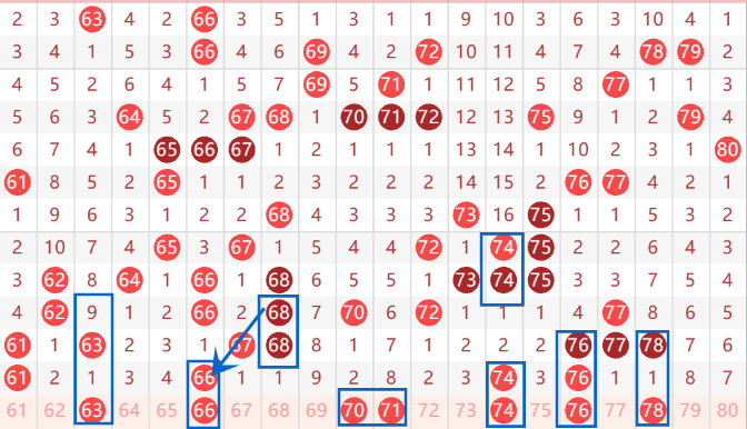本期的63的是属于遗漏9期的空一回补,可以关注一下。66号数字我们也是关注一下出重号的情况。71是属于遗漏8期的号码,本期我们要注意71 79的出号情况了。本期的74 76应该也是会出一个重号的情况。