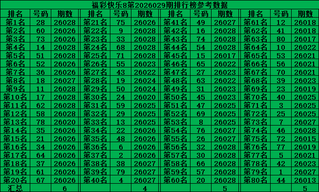 把号码分为四区:一区01-20号、二区21-40号、三区41-60号、四区61-80号,理论上每个区每期应该开出5个号码: