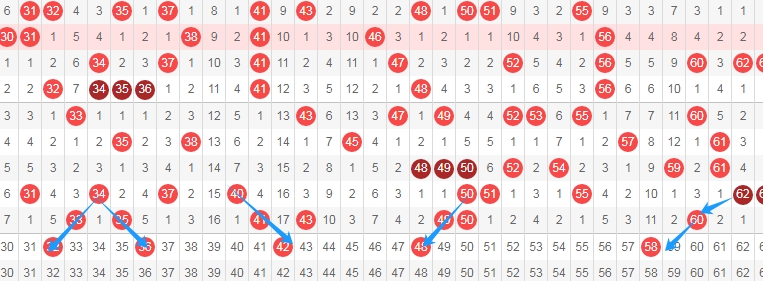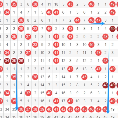 上图是福彩快乐8开奖号码走势分布图其中一部分走势图,我在上面走势图中标注出来的数字这个区域一共有数字13个,这13个数字已经连续10期没出现过连号组合,这个区域的连号组合有3637 3738 3839 3940 4041 4142 4243 4344 4445 4546 4647 4748一共有12组 ,上次开出连号还是上面标注出来的蓝色箭头出现的4647,那么本期这个区域可以留意出连号组合,最近这个区域出号码也不多,所以本期这个区域的可以考虑出一组两组连号或者考虑出三连号,个人最看好3637 3940 4243 4445。