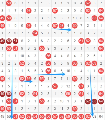 上图是福彩快乐8开奖号码走势分布图其中一部分走势图,我在上面走势图中标注出来的数字这个区域一共有数字12个,这12个数字已经连续4期没出现过连号组合,上次是连续6期没出现过连号组合,这个区域的连号组合有5152 5253 5354 5455 5556 5657 5758 5859 5960 6061 6162一共有11组 ,上次开出连号还是上面标注出来的蓝色箭头出现的5253,那么本期这个区域可以留意出连号组合,最近这个区域出号码也不多,所以本期这个区域的可以考虑出一组两组连号或者考虑出三连号,个人最看好5152 5354 5556 5758。
