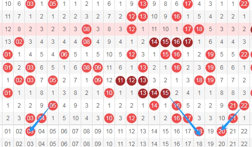上图是福彩快乐8开奖号码走势分布图其中一部分走势图,我在上面走势图中标注出来的数字03 18 20你们觉得这三个数字可以看好不?看上面标注出来的蓝色箭头都是斜连号码,数字03一直是从数字05斜连下来,数字18是从数字15一直斜连下来,数字20是从数字22一直斜连下来。