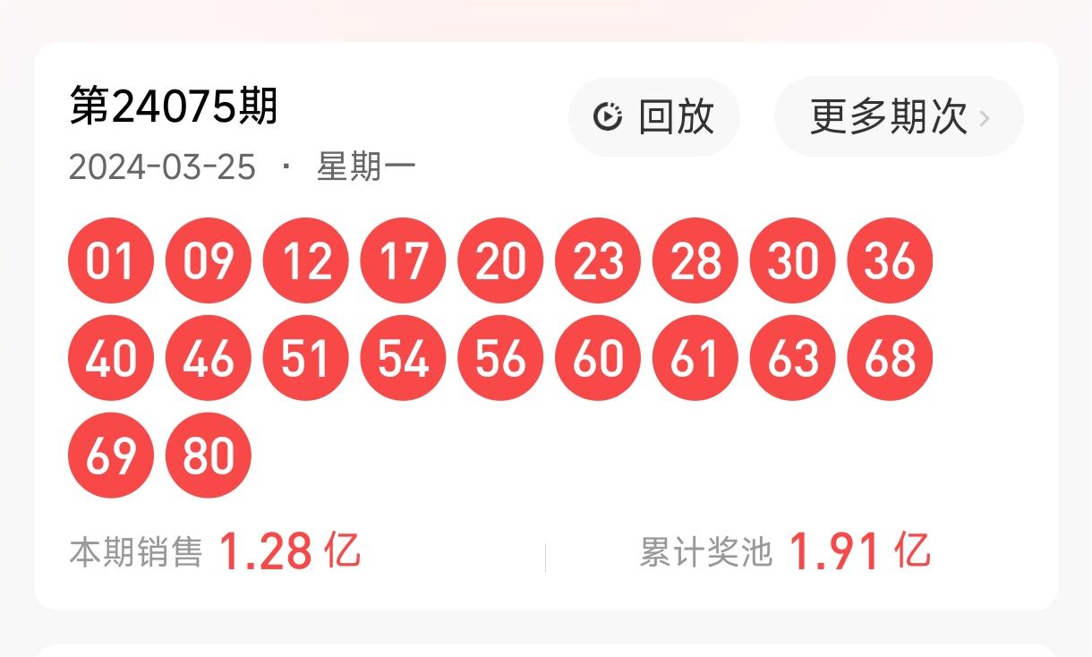 首先回顾上期的开奖号码: 01 09 12 17 20 23 28 30 36 40 46 51 54 56 60 61 63 68 69 80