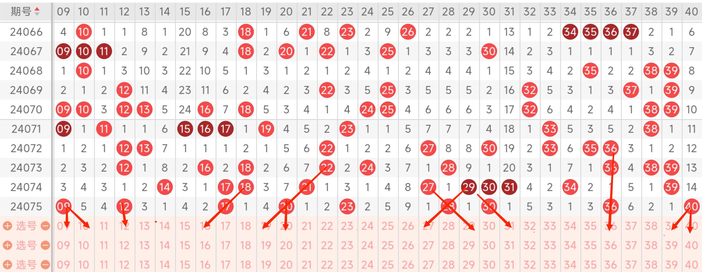 区间分析:24073期开出六个号码球和24074期开出七个号码球的走势转变到24075期仅开出四个号码球,二区的热度预计本期继续开出四个号码球的走势,目前的连出走势有号码球30号球的二连出走势和斜开奖走势开出的号码球28号球和号码球30号球的开出和号码球40号球的斜开奖走势开出,本期继续追号码球27号球的斜开奖走势开出和号码球31号球的斜开奖走势开出和号码球预防号码球29号球的开出走势和预防号码球36号球的二连出走势和预防号码球40号球的二连出走势!