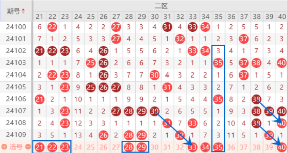 本期的21号数字是属于空三对称号码,本期的空三对称号码21 64号数字我们注意出一个号码的情况。本期的22 23号数字我们注意出一个号码的情况,本期的23号数字是属于空一对称号码,出号机会很大的,可以重点关注一下。上期开出了26 28 29号数字连号空一带号,本期我们注意一下出一个重号的情况,重点关注一下28 29号数字出一个重号的情况。本期的35号数字是属于323走势,出号机会很大,可以重点关注一下。本期的40号数字也是要重点关注一下。