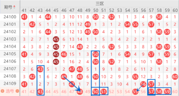 本期的48号数字我们注意一下出号情况,属于三斜连号码。本期的44号数字我们也是要防守一下,44 47 50号数字形成了三斜连号码,出号机会还是有的。本期的51 53号数字都是属于冷号,又在一个断区内,我们要注意出一个号码的情况。这里可以关注一下50 51号数字同出的情况。上期开出了56 57号数字,本期我们注意一下出重的情况,重点关注一下57号数字出重的情况。