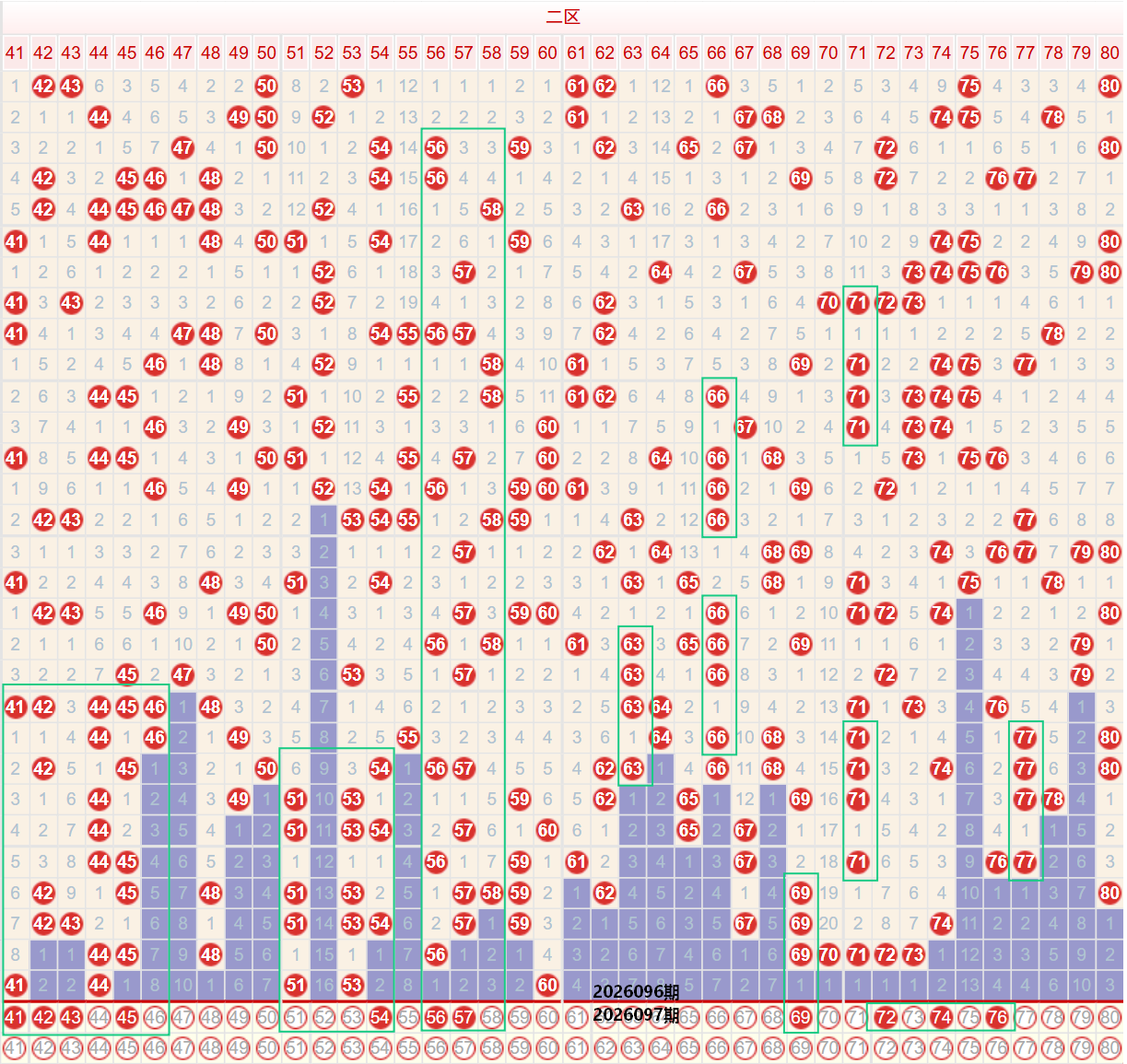 如图所示:在本期大数区的选号中注意在上期的走势中三区间开出了5枚中奖号码,落号数量再次回调值均值走势,在近期的走势中,三区间的落号数量相对较为稳定,且连续值较高,因此在上期的走势中三区间再次回调至均值走势之后,本期要注意三区间的落号数量继续保持在均值或者是出现落号数量上升的走势,在上期的三区间再次开出51 53的双码走势,本期注意51 53的重号走势,或者是考虑49 54的近期多次出现交替的走势,前段位置在上期开出41 44的下方注意多码走势,另外在上期三区间尾部位置开出60之后,本期注意57或者是57 54的同路延续走势,四区间上期开出了0枚中奖号码,出现了断大区间的走势,本期注意在五连号的下方注意回补走势,建议向前考虑奇数走势,向后考虑偶数走势。