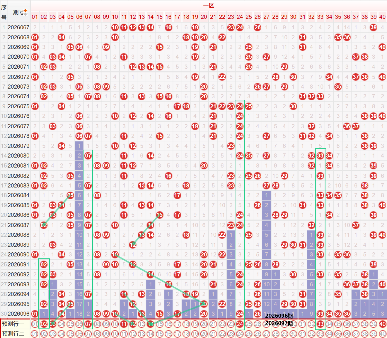 如图所示:在本期小数区的选号中,注意在上期的走势中一区间开出了9枚中奖号码,出现了爆单区的走势,落号形态较为饱满,开出了08 09 10的三连号,以及13 15 17的奇数三连号,前后两组01 04-17 20的同路双码走势,本期注意14的斜线第四期走势,在近期的走势中开出过两次同形态走势,同时要注意在上期开出13 15 17的奇数三连号之后,在前后的位置考虑一组偶数二连走势,如12 14或者是16 18,前段位置01 02 03目前依旧保持着连续走势,上期开出了01的延续走势,本期注意03的斜线第三期走势,以及02 03的二连走势,在上期开出08 09 10的三连号下方注意07 11的分边走势,重号注意17 20的选择,二区间上期开出了6枚中奖号码,开出了区间同尾24 26 34 36的四码走势,以及33 34 35 36的四连号走势,本期注意24的重号选择,以及33的重号选择,尾部位置上期开出了三区间的41号,本期注意41的重号选择,以及边号40的选择。