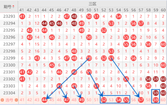 该区间的44号数字是属于斜连号码,又是遗漏9期的号码,本期遗漏9期的有4个,本期应该是会出号了,我们要重点关注一下。本期的47号数字注意一下,以46 48对标,出号机会还是有的。本期的连号52 53号数字我们要注意落下一个号码的情况。本期的54号数字是属于遗漏11期的号码,本期遗漏11期的号码有3个,我们要注意出一个号码的情况。上期开出了三连号59 60 61,这里我们要注意出重的情况,重点关注一下59 61的出号情况。