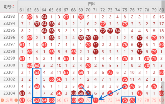 本期63号数字我们要注意一下,也还是空一对称号码,出号机会还是有的。64号数字是属于遗漏7期的号码,遗漏7期的号码已经有3期没有出了,本期我们要注意出号情况。上期开出了三连号68 69 70号数字,本期我们要注意走重的情况,重点关注一下68 69出重的情况。本期的71 72号数字我们也是要注意出一个号码的情况,重点一下71号数字的出号情况。连号75 76号数字我们也是要注意出号情况。