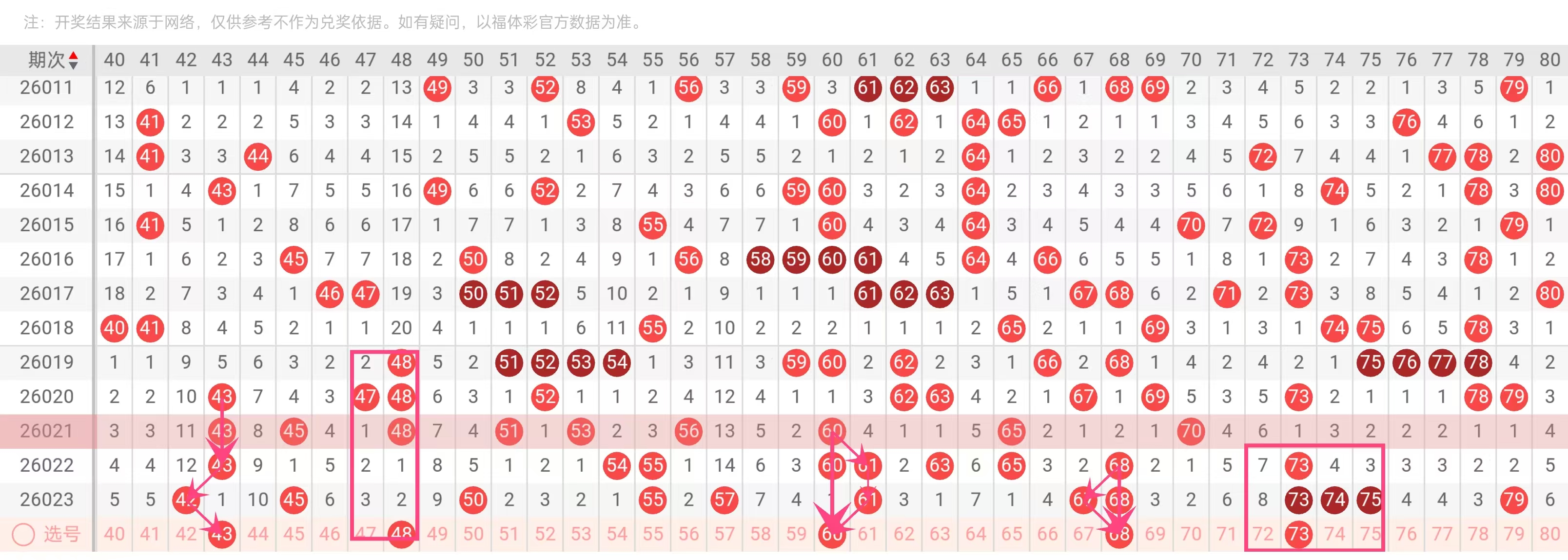理由:热号之一,近5期出现3次(2026023、2026022、2026019期),属于61-80大号区活跃代表。该号码近期常与67、73等形成小范围集群,且在偶数号中表现强势,适合作为大号区胆码。