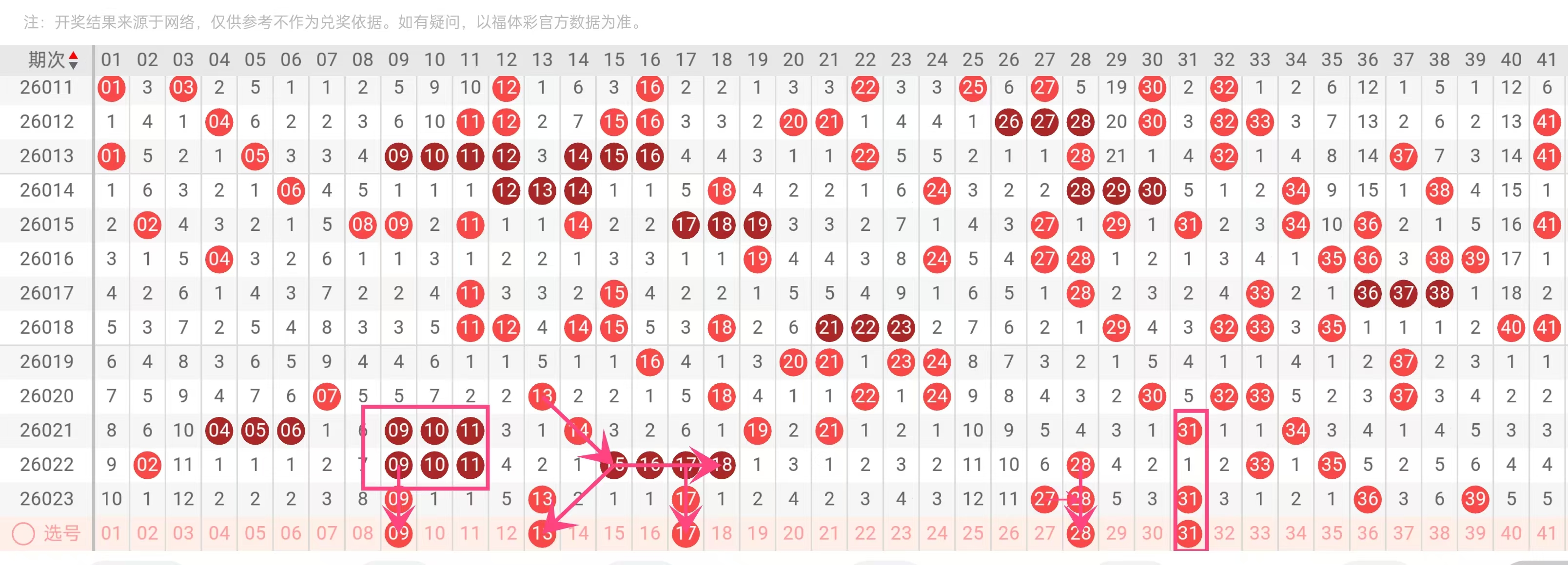 理由:稳定热号,近5期出现2次(2026023、2026021期),属于质数活跃号。31在历史数据中常与34、36等同区间号码搭配出现,近期奇数号表现均衡,该号有望延续热度。