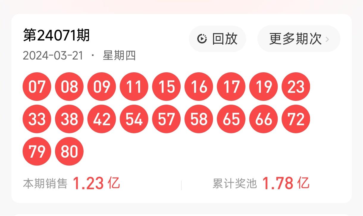首先回顾上期的开奖号码:07 08 09 11 15 16 17 19 23 33 38 42 54 57 58 65 66 72 79 80