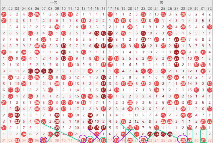 二区胆尾9尾6尾,上期0尾断尾,预判本期0尾回补在二区,那就是20 30二出一,重号边号没断9尾1尾连出4期,重号看看19 21,其次看23,边号18 20 22 27出号,形态上18 22 28是斜连号上图已勾画,隔一期号没断本期20 29 31符合,上图已勾画,本期关注五码18 19 20 23 30