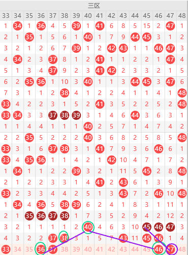 三区胆尾5尾6尾,形态上6 46 47是斜连号上图已勾画,6尾连出五期没断本期跟一期,46不出三直落就是36, 5尾连出3期本期可能出三直落45,边号看36 37 39 42 44 47要出一码,6尾7尾最热看好36 47,预判连号出47 48,本期关注四码36 45 47 48 防33