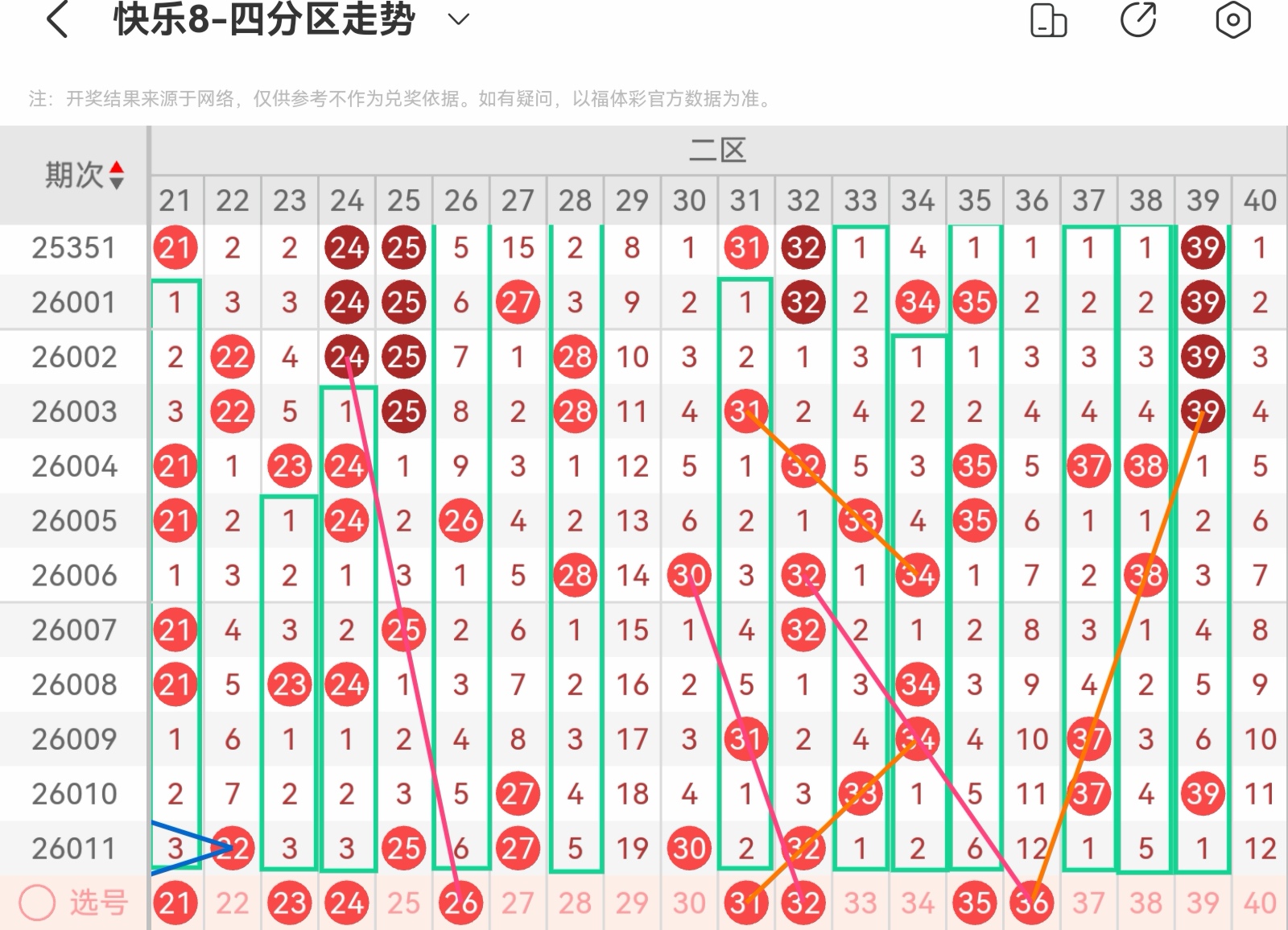 上期开出码,区间平稳,本区防3-5码开出。上期重号开出一码本期重号防一码开出,注意32开出重码的可能大遗漏号29.36.40上期形态走势开出四码,本区形态走势有:21.23.24.26.28.31.33.34.35.37.38.391-3码, 重点关注21313走势,26196走势,31252走势以及35126走势,小防23的隔期空三走势以及24123走势上期空位走势开出一码,本区空位走势有:空一26.31,空二23.2428.29,共六码防上期斜连走势开出一码,本区斜连走势有:四斜连31本区注意重号、连码以及空位号码,隔期号码回补开出。