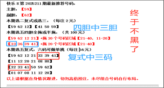 太行老赫快乐8第2025212期走势分析:上期终于中三胆